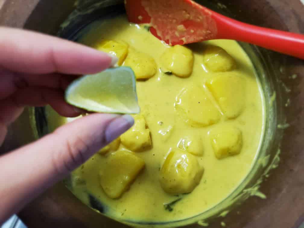 Then squeeze a few drops of lime juice. (this step is totally optional) it thickens up the curry just a little bit more, helps to cut through the creaminess.