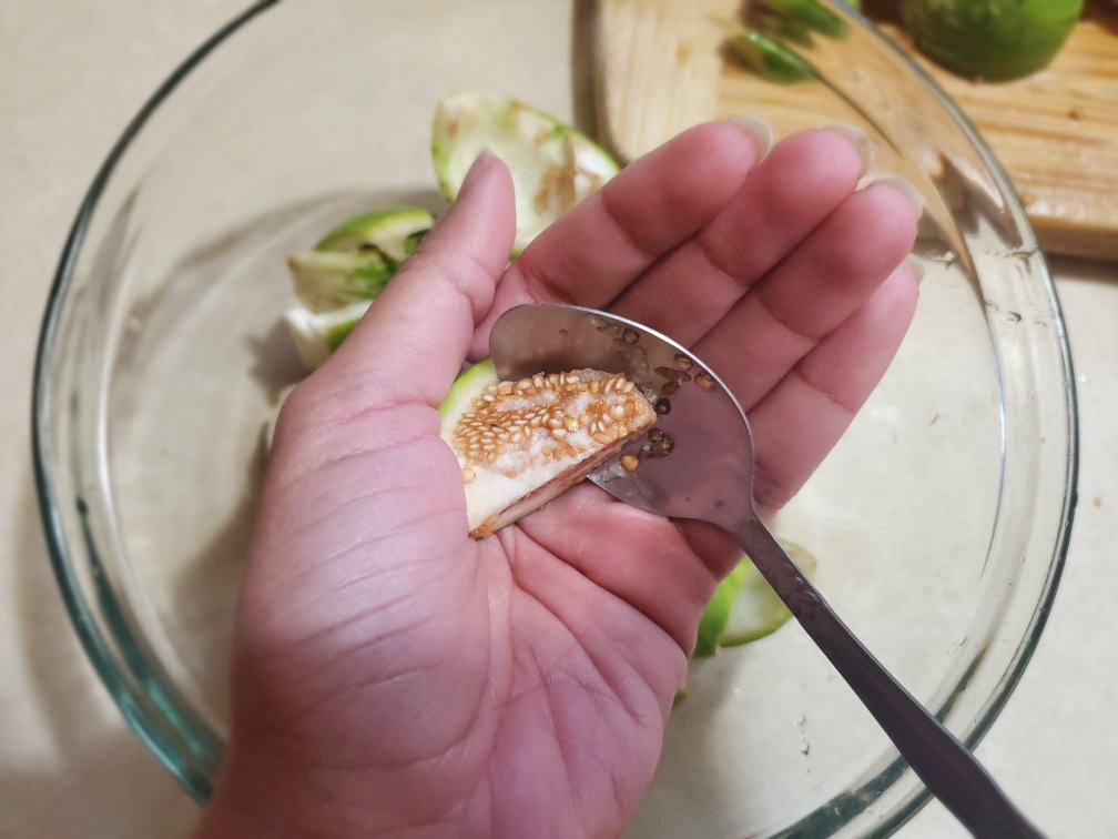 Up until this day, my mom uses the smashing method I mentioned above to clean out the seeds. She put the eggplants into a plastic bag, place the bag on a flat surface and then smash the bag with a coconut until they split open and seeds come out. And then transfer everything to a big bowl, fill it up with water and rinse out the seeds. This method is easy but you won’t get unform pieces and it’s a little messy, you get seeds all over the sink. You have to rub the seeds from the fruit with your fingers, which can stain your fingers. You can use this method or you can use my method. I cut them into quarters. And then snuck a teaspoon under the bundle of seeds and scrape the whole bundle in one go. But whichever method you use, it’s fine with this curry as long as you remove all the seeds.
