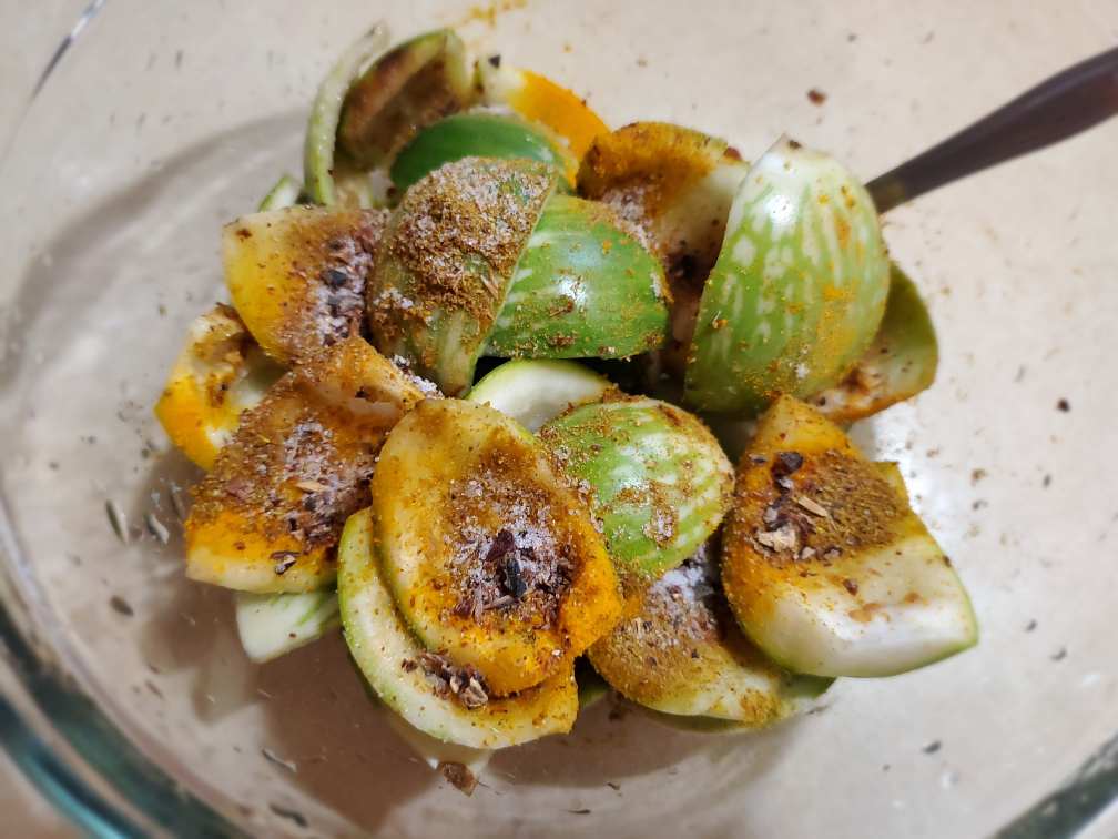 Mix Thai eggplant pieces with curry powder, turmeric powder, 1/2tsp salt, and Maldive fish flakes (don’t worry if you don’t have this ingredient). You can use a spoon or put everything into a container, cover and shake the container to mix everything.