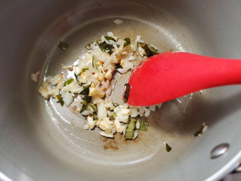 Heat coconut oil. Add pandan leaves (I didn’t have this ingredient at that time), curry leaves, fenugreek seeds, chopped garlic, and onion, and temper them in oil until garlic start to turn light brown on the edges.