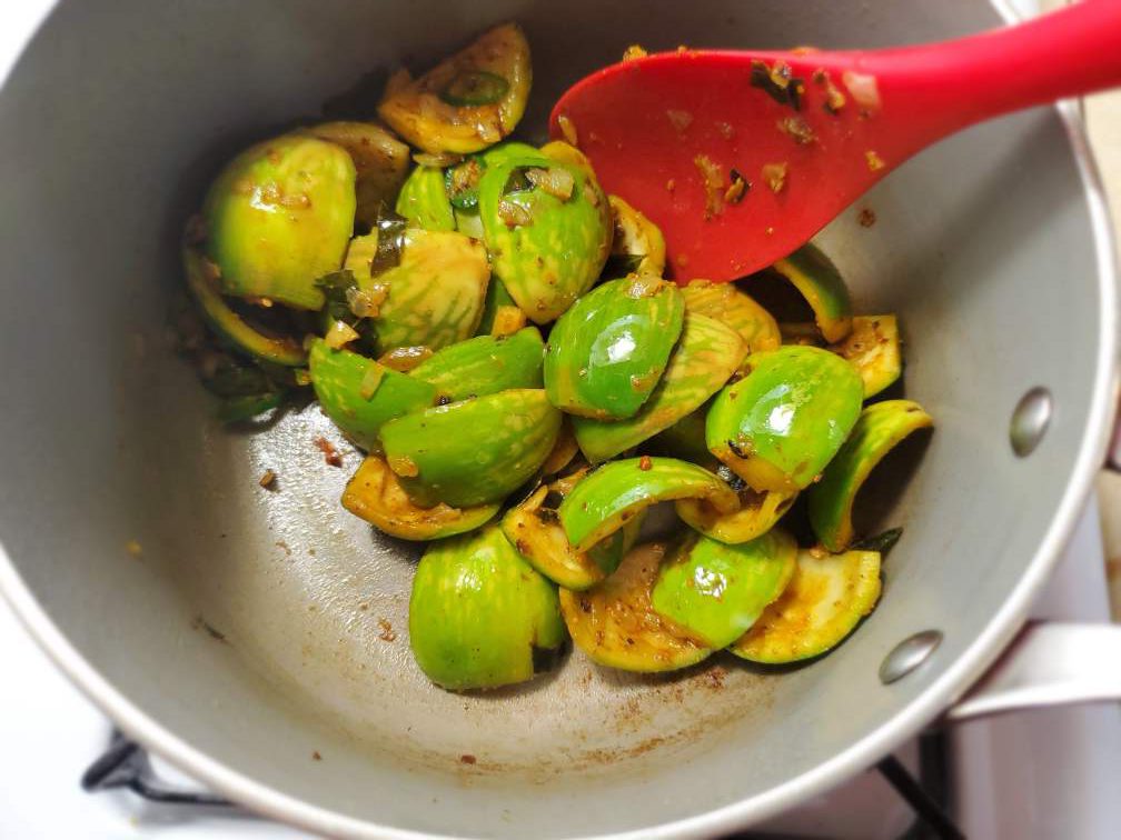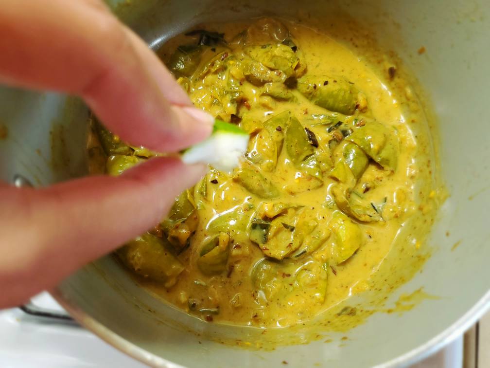 Add thick coconut milk and mix everything only once (if you want more gravy, add more coconut milk, if you like a thick dry curry then add less). Cook the curry on low heat, uncovered, until the liquid reduces to your desired consistency. Do not keep stirring otherwise the flesh of the eggplants would dissolve in the curry and make it mush. Shake the pan from time to time to prevent the bottom from sticking and to mix everything.