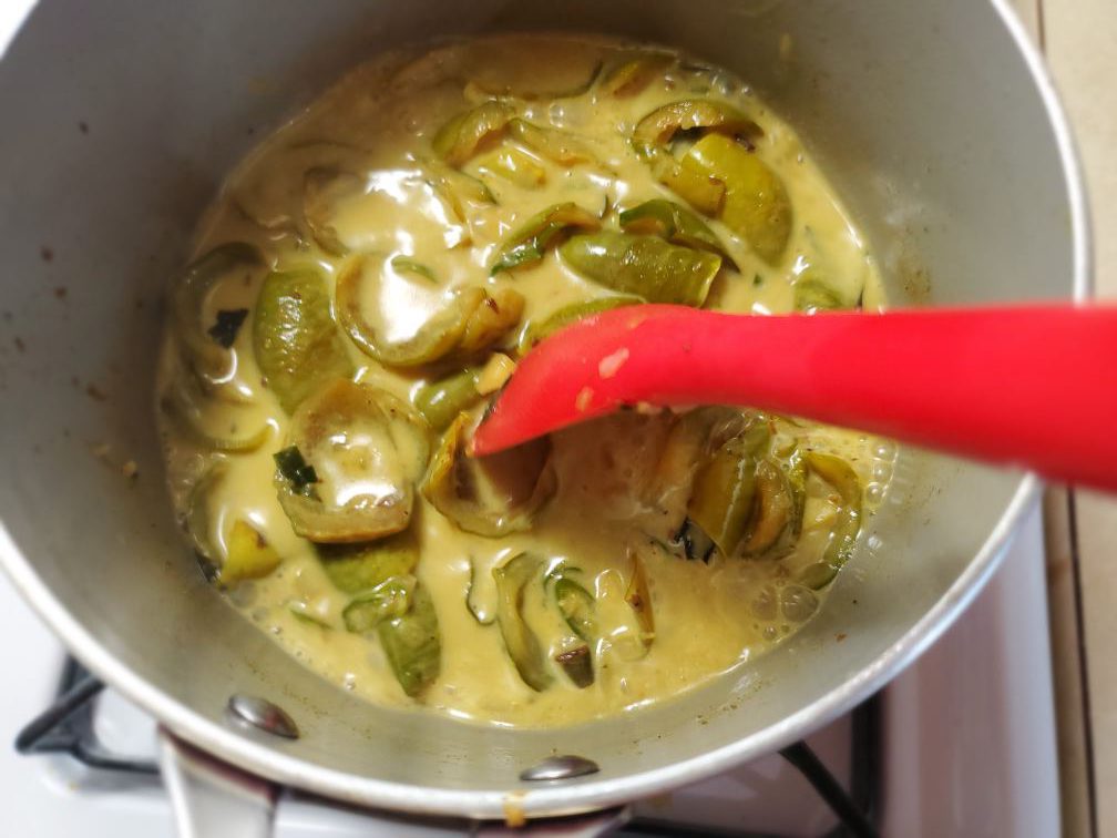 Add thin coconut milk, mix well and bring to simmer. Then reduce the heat, cover with a lid and cook until Thai eggplant pieces are tender.