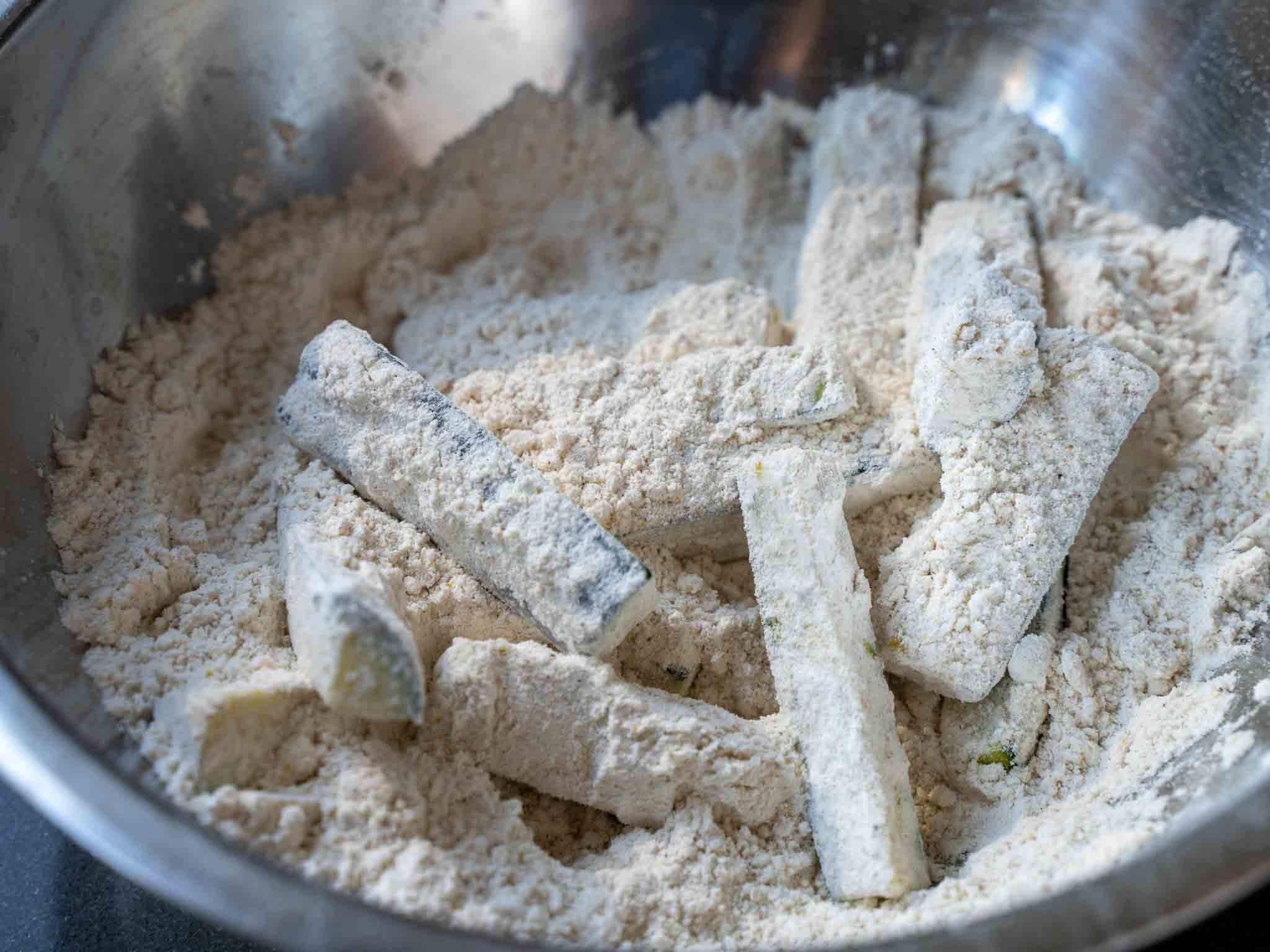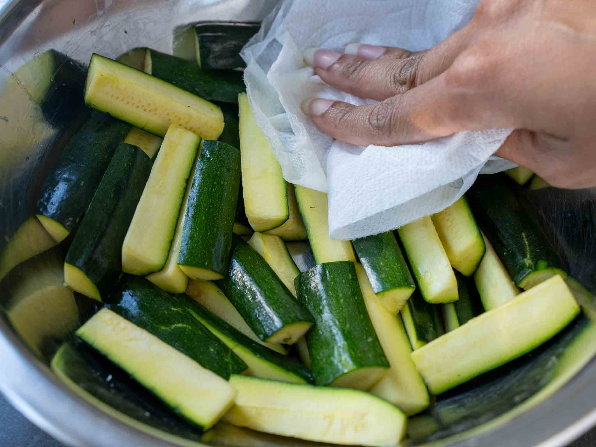 - Make sure to remove any excess water when you salt them. You can skip salting the Zucchini, but I find they taste better when you season them first before covering with the flour mixture.