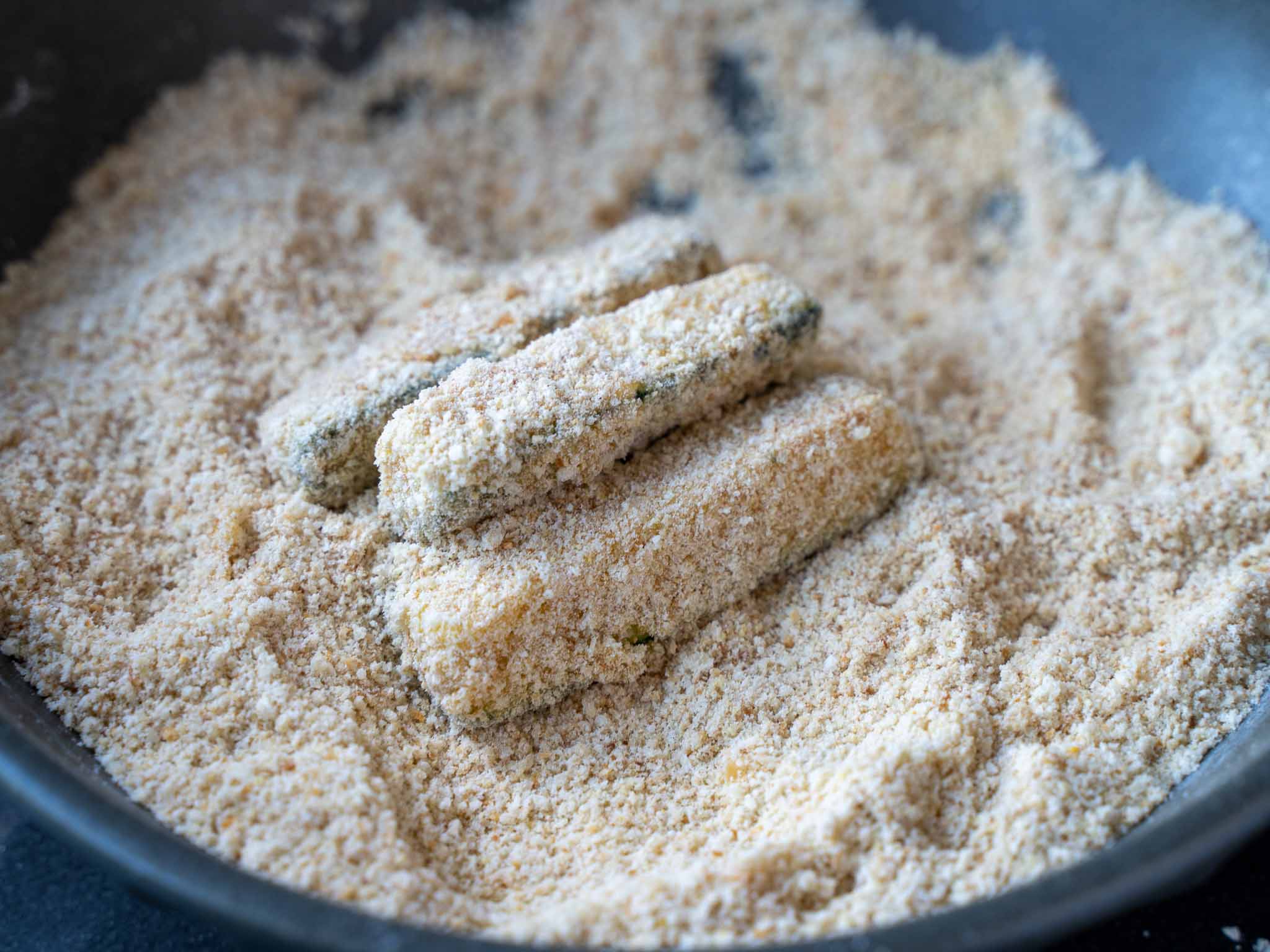 Then add the zucchini wedges to the breadcrumbs mixture and coat them well. Gently shake off excess breadcrumbs.