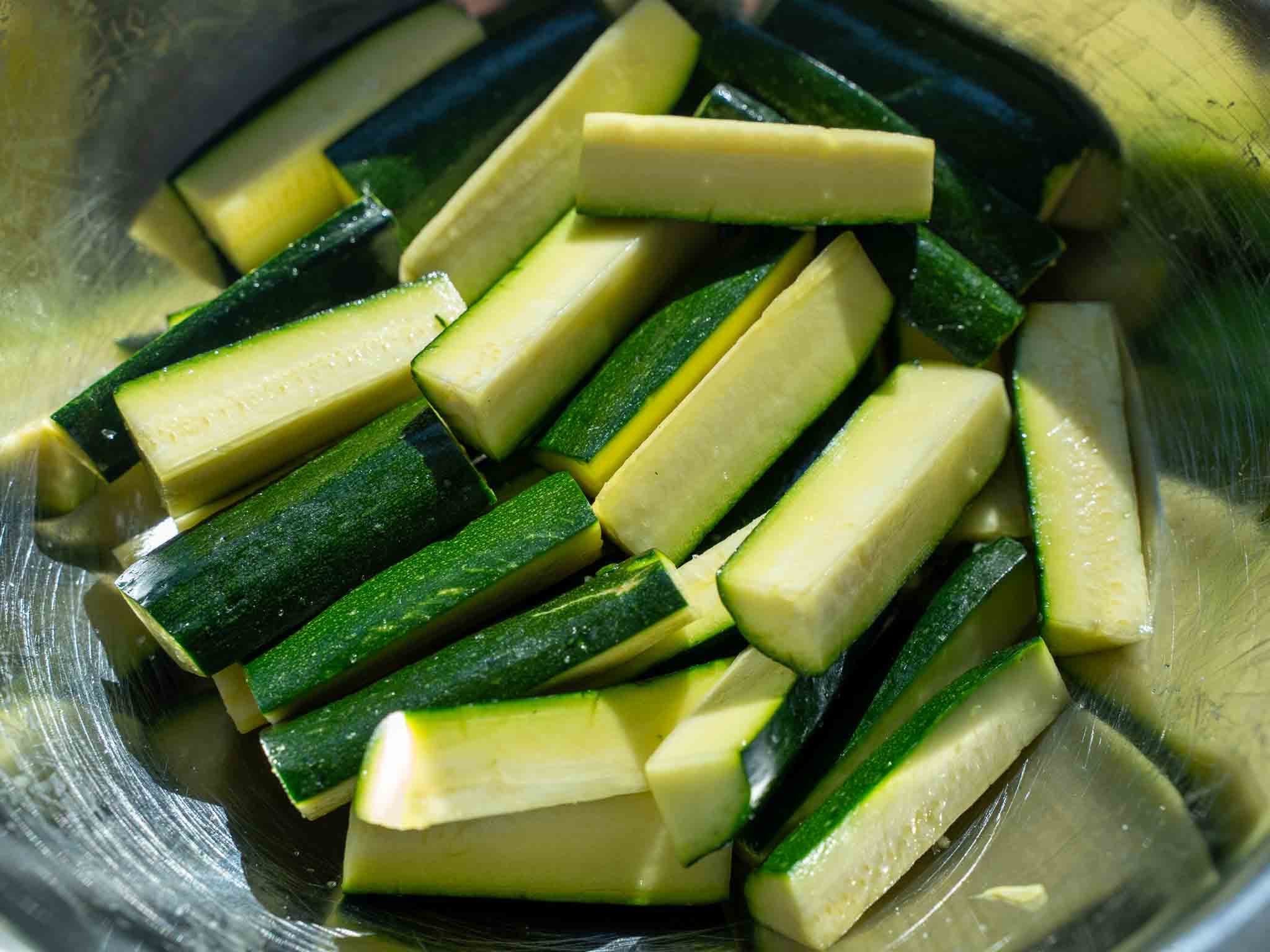 Cut the ends of the zucchini and cut them into 3-inch-long wedges that are about 1/2 inch thick. Mix 1/4 tsp salt. Leave them aside to sweat for about 15 minutes.