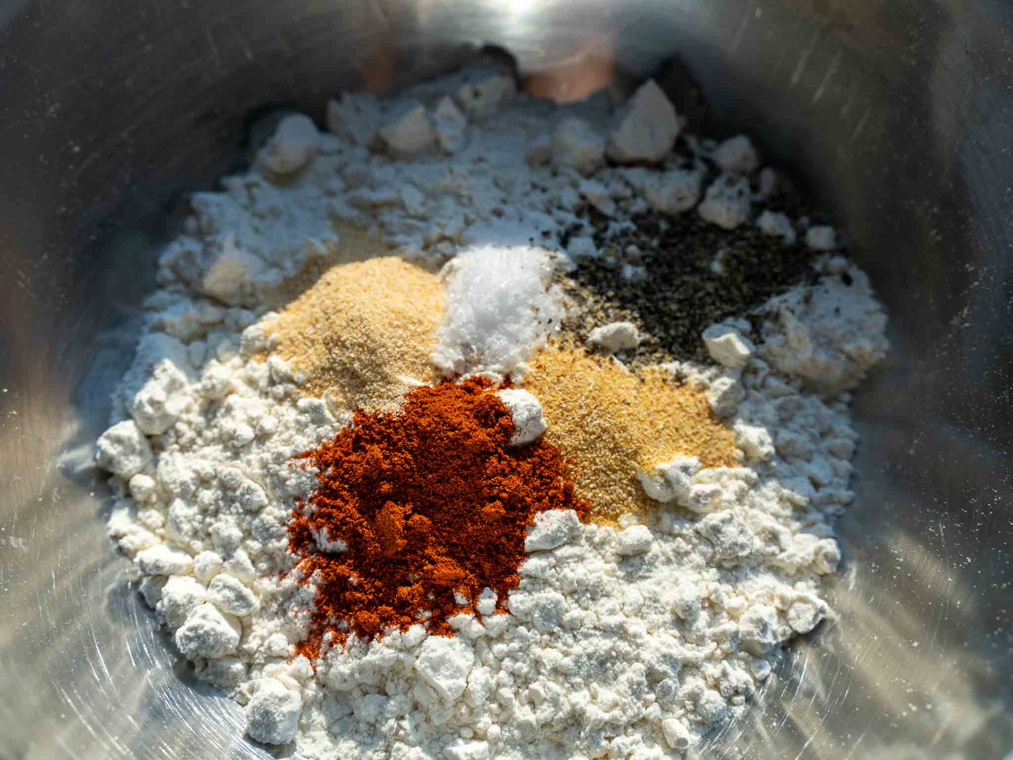 Meanwhile, in a bowl, mix flour, salt, pepper, granulated garlic, granulated onion, and paprika.