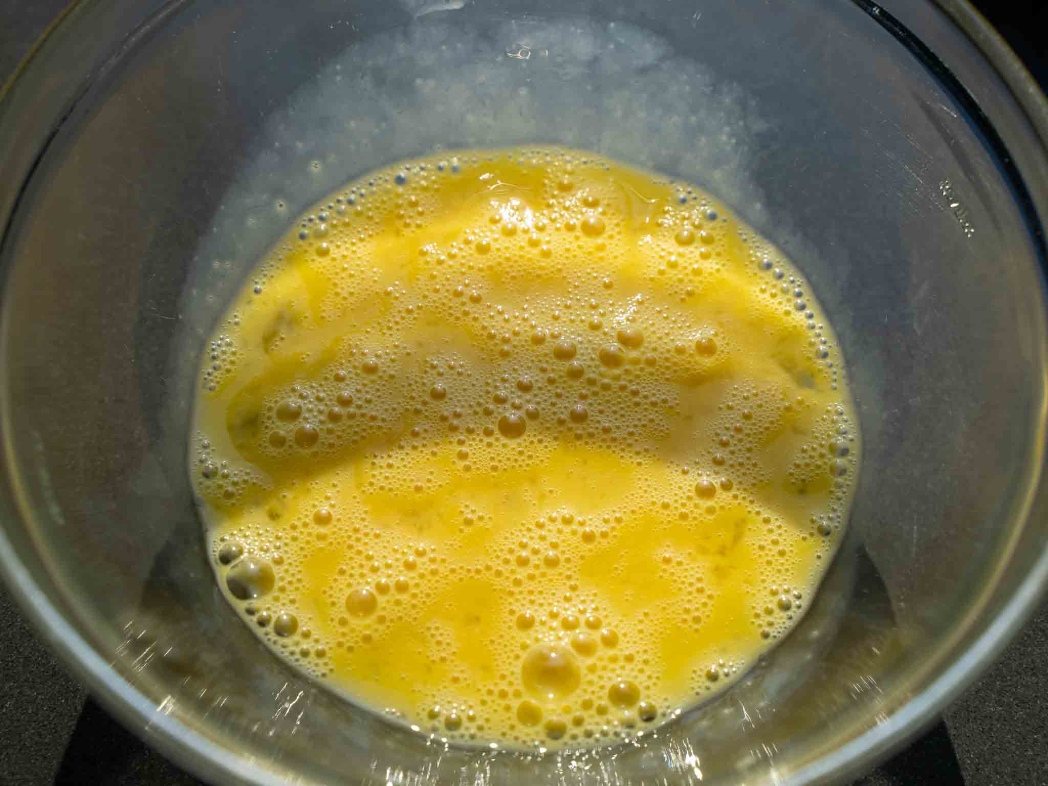 In a separate bowl, crack eggs and whisk until whites and yolks are well mixed.